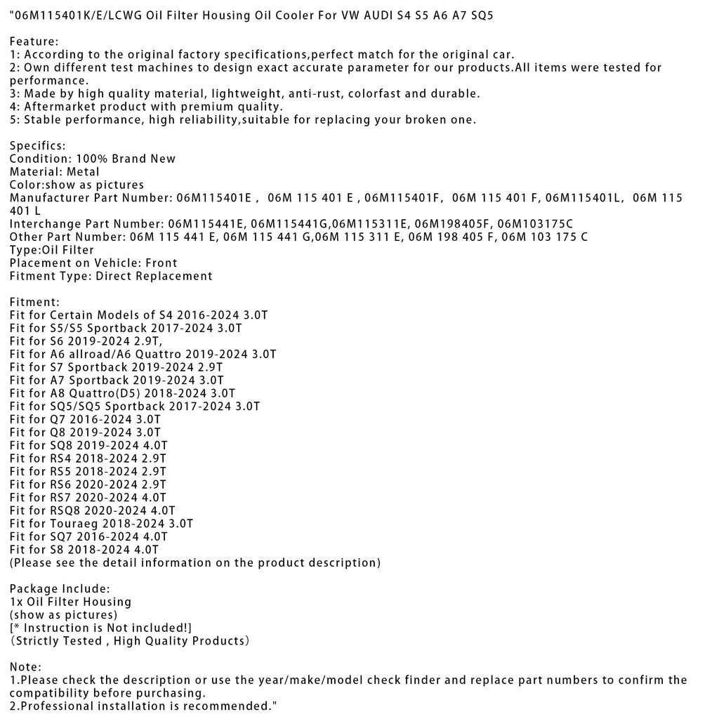 06M115401K/E/LCWG Ölfiltergehäuse Ölkühler für VW AUDI S4 S5 A6 A7 SQ5