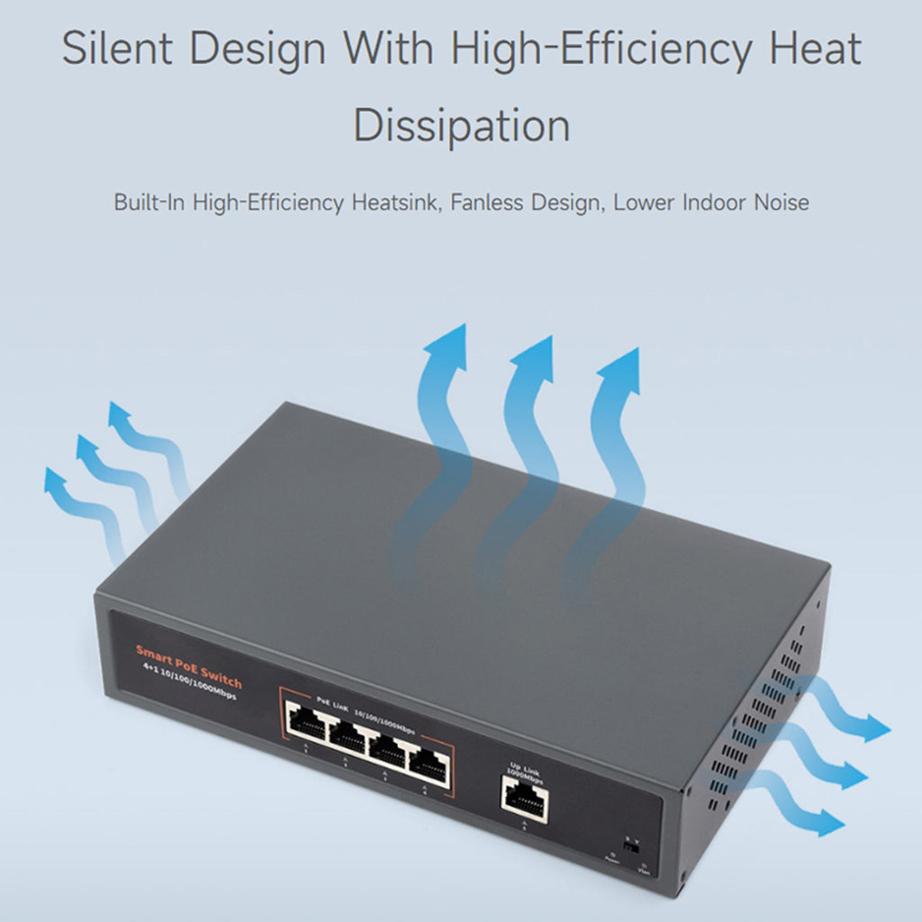 Je speciálně navržen a vyvinut tak, aby splňoval potřeby napájení PoE a využívá novou generaci vysokorychlostních ethernetových přepínacích čipů a design s velkou šířkou pásma (také známý jako přepínání pásma). Má extrémně rychlé možnosti zpracování dat a zlepšuje výkon přenosu dat. Je vybaven čtyřmi porty pro stahování RJ45 s napájením PoE a jedním portem pro stahování RJ45. Napájecí výkon jednoho portu může dosáhnout až 30 W špičkového výkonu a špičkový výkon celého stroje je 120 W. Dokáže automaticky detekovat a identifikovat napájená zařízení, která vyhovují standardu IEEE 802.3af/at, a napájet přes to. Dejte přednost síťovým kabelům.