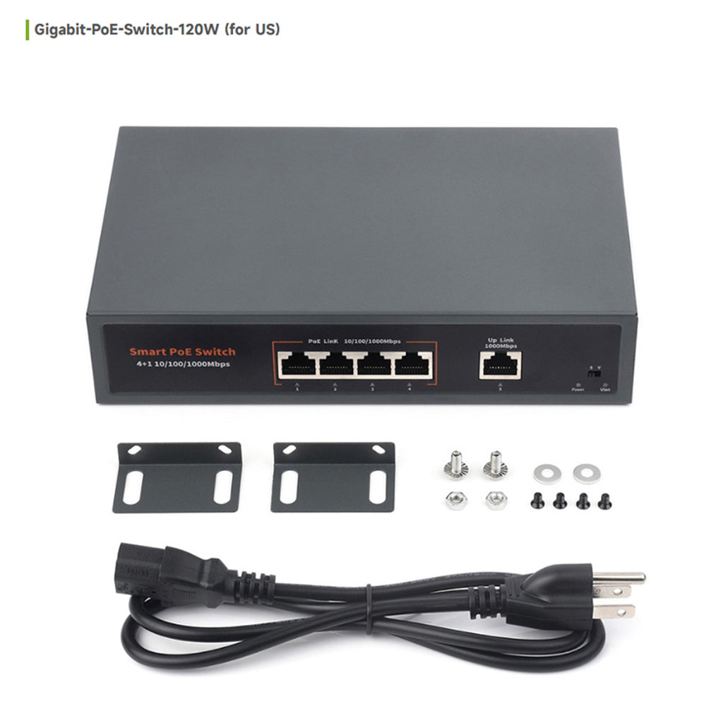 Porty: 4 10/100/1000 Mbps RJ45 PoE porty, 1 10/100/1000 Mbps RJ45 uplink port