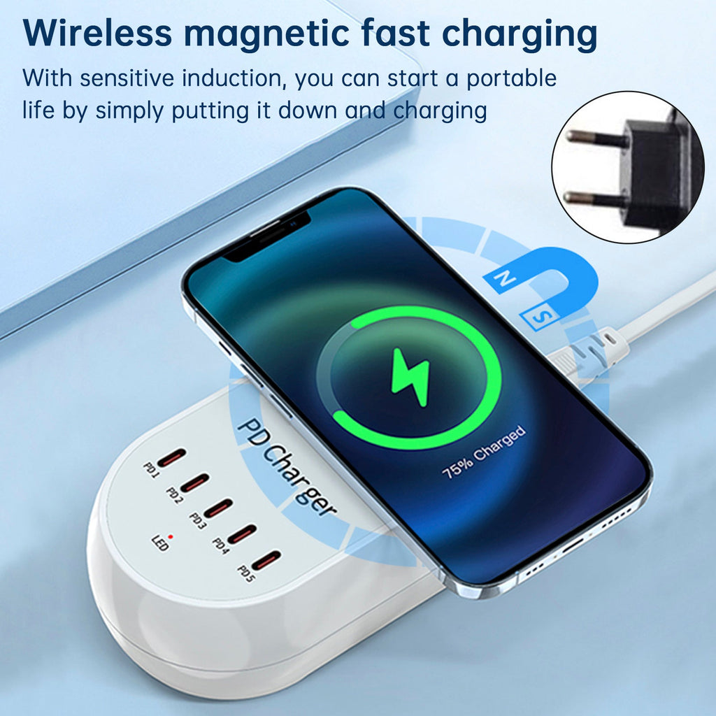 14. Kompatibel mit verschiedenen Geräten, fünf PD-Anschlüsse + ein kabelloses Ladegerät, das mit verschiedenen Geräten kompatibel ist, kann verschiedene Geräte, Mobiltelefone, Tablets, Notebooks, Bluetooth-Headsets aufladen