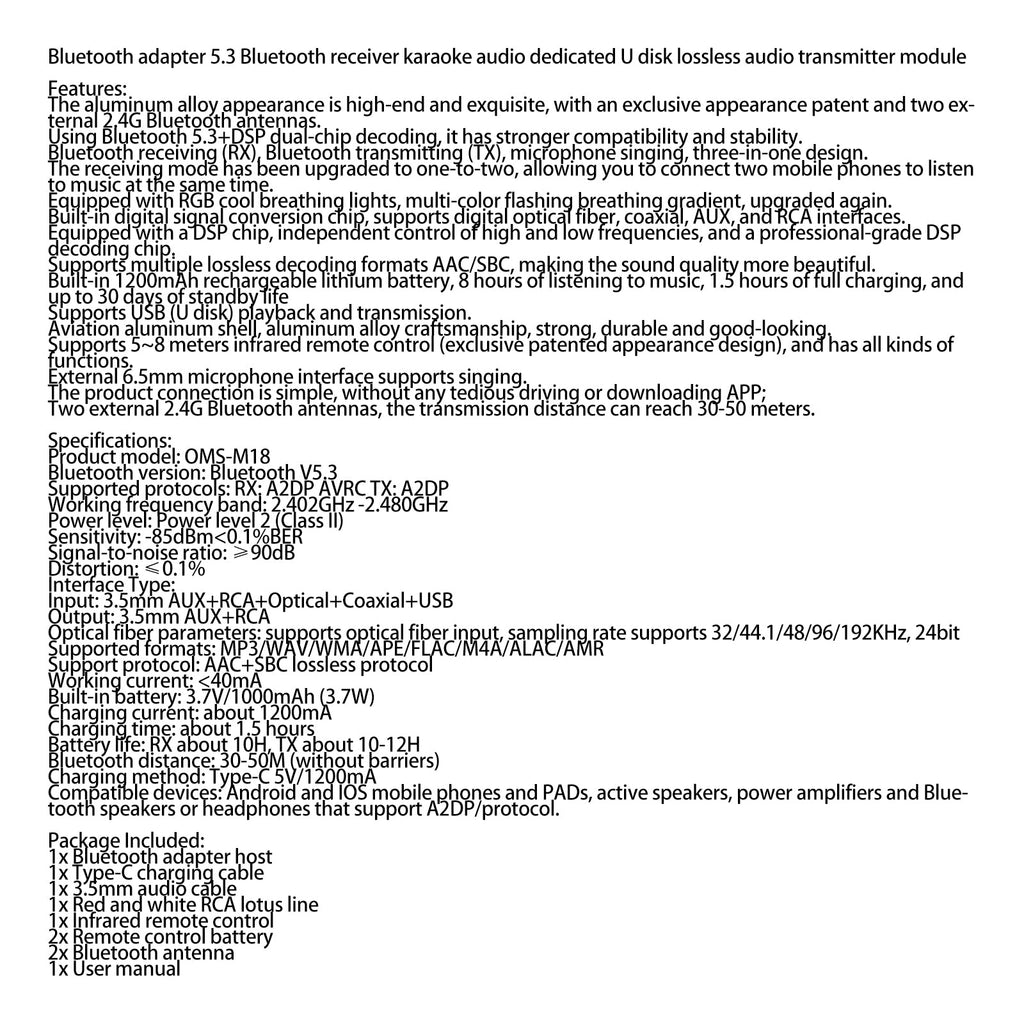 Kompatibilní zařízení: Android a iOS mobilní telefony a PAD, aktivní reproduktory, výkonové zesilovače a Bluetooth reproduktory nebo sluchátka, která podporují A2DP/protokol.