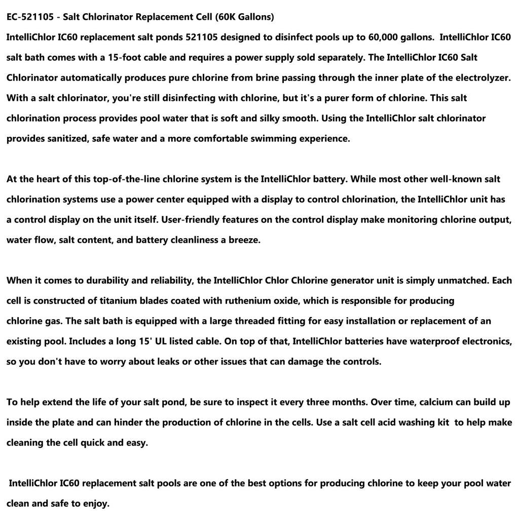 IC60-Ersatzsalzpools sind eine der besten Möglichkeiten zur Herstellung von Chlor, um Ihr Poolwasser sauber und sicher zu halten.