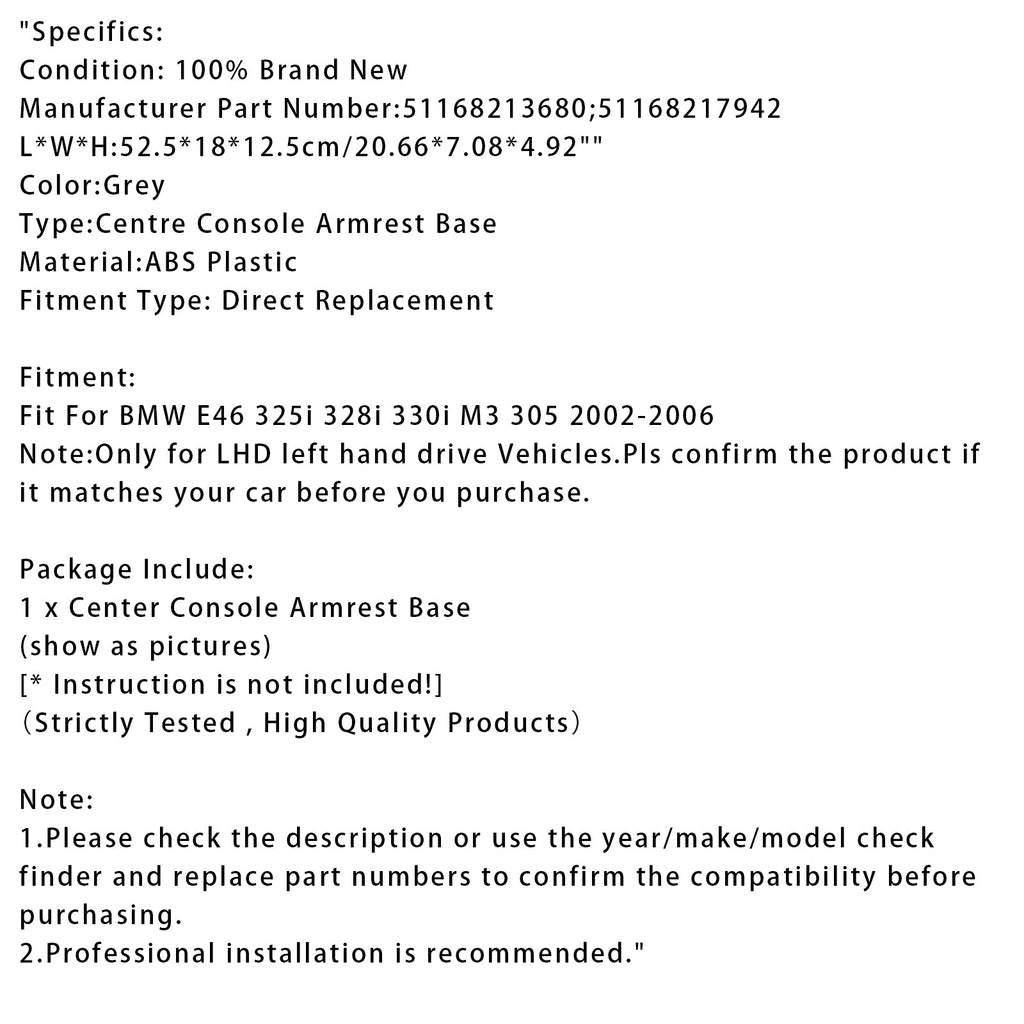 Grey Centre Console Armrest Trim Base For BMW E46 325i 328i 2002-2006 51168213680