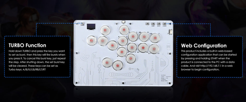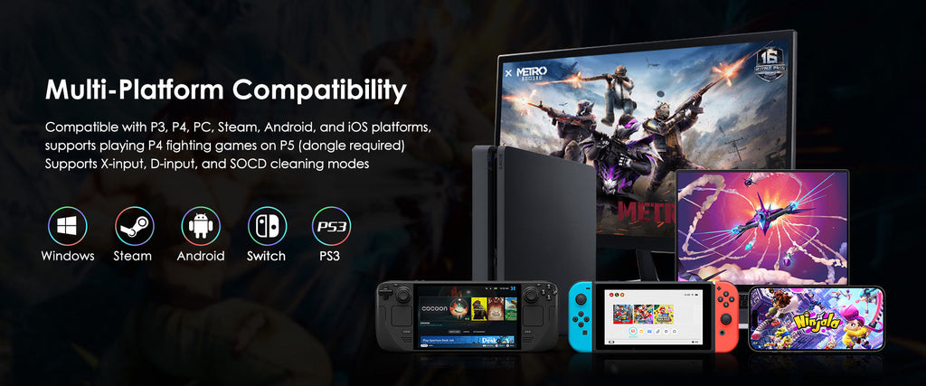 Kompatibilní s platformami P3, P4, PC, Steam, Android a iOS, podporuje hraní bojových her P4 na P5 (vyžaduje hardwarový klíč) Podporuje X-Input, D-Input a režimy čištění SOCD