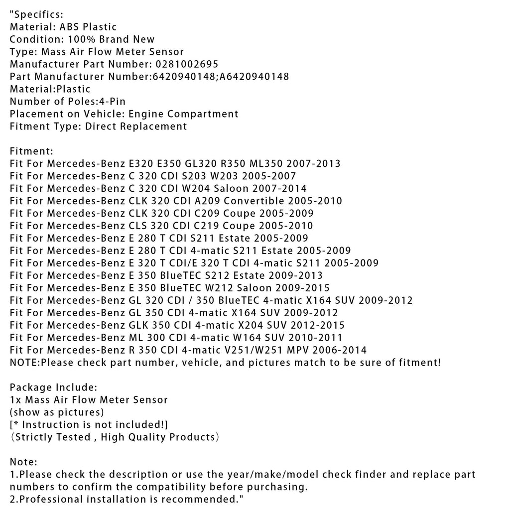 Mass Air Flow Meter Sensor For Mercedes E350 ML350 E320 R320 0281002695