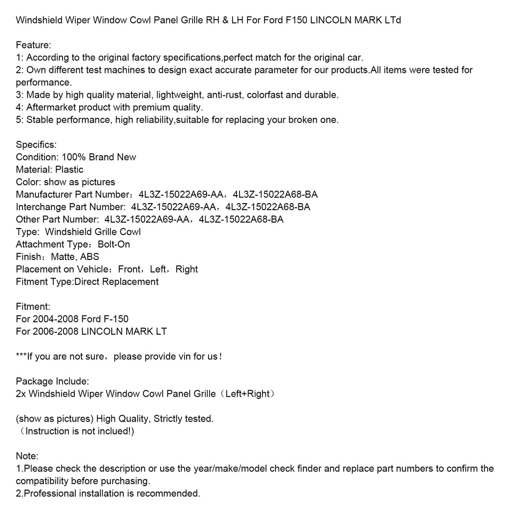 Stěrač čelního skla Mřížka krytu okna vpravo a vlevo Vhodné pro Ford F150 LINCOLN MARK LTD