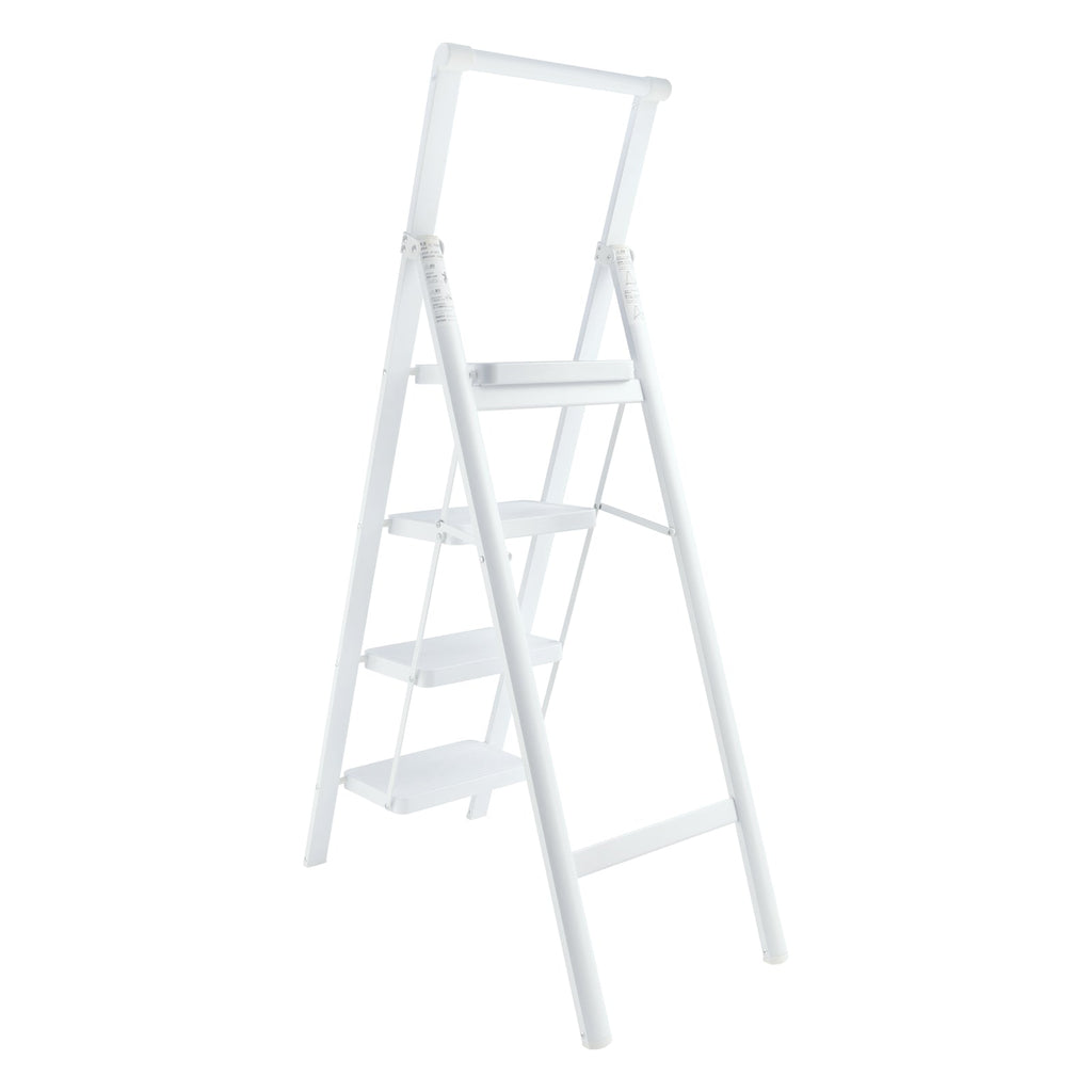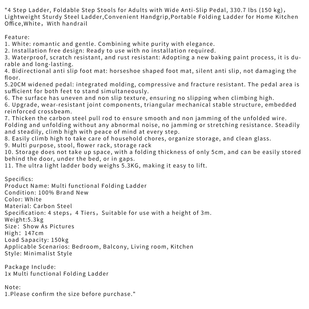4-trins stige foldestige til voksne med bred anti-skrid pedal 150 kg (330,7 lbs) Letvægts robust stålstige Praktisk håndtag bærbar foldestige til hjemmekøkkenkontor Hvid med gelænder