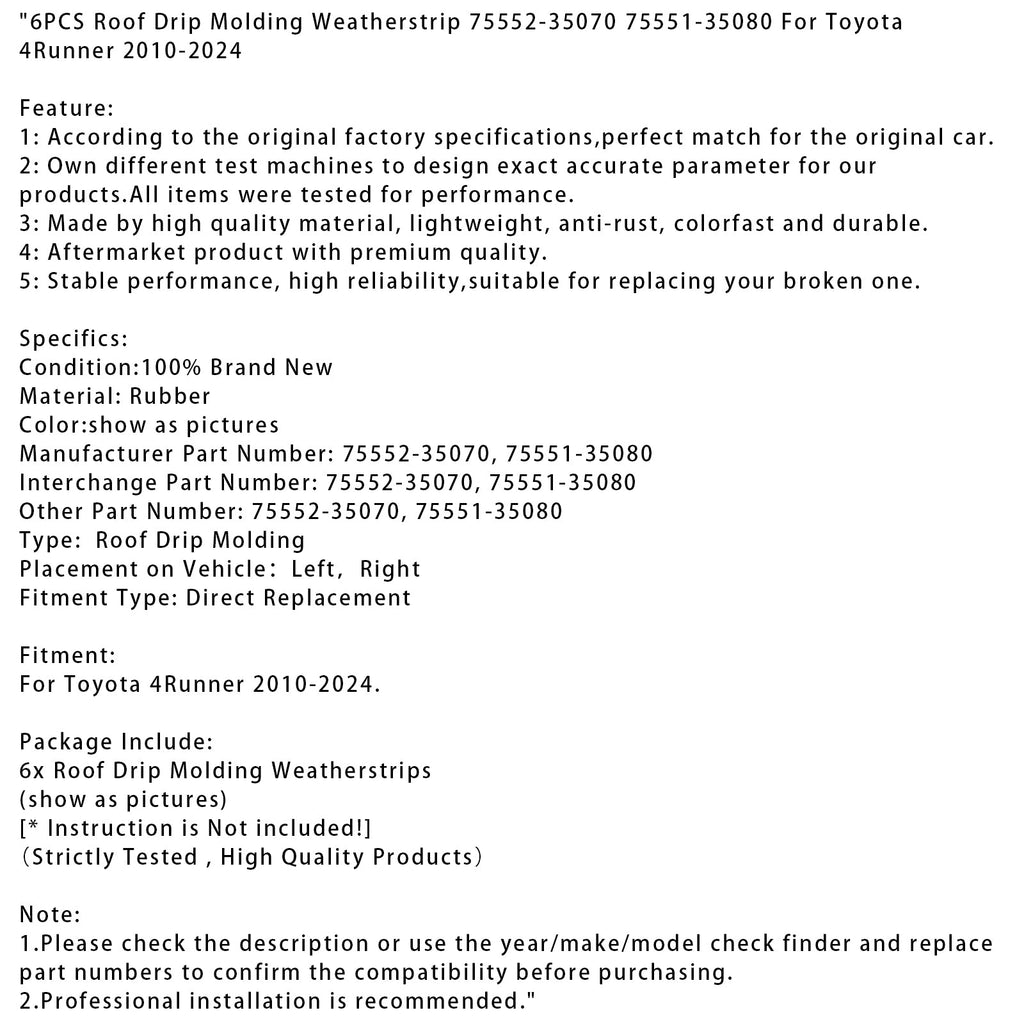 6-teiliges Set Dachtropfleisten-Dichtungsprofile 75552-35070 75551-35080 Passend für Toyota 4Runner 2010-2024