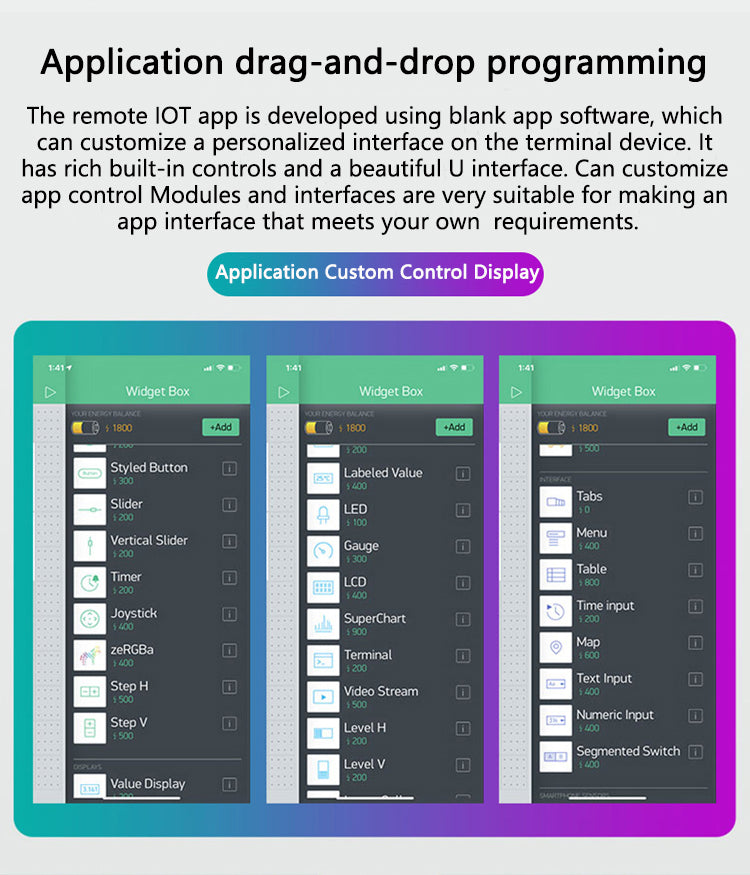 Den eksterne IoT-app er udviklet ved hjælp af tom app-software, der kan tilpasse en personlig brugergrænseflade på slutenheden. Den har omfattende indbyggede kontroller og en smuk U-grænseflade. Kan tilpasse app-kontroller
