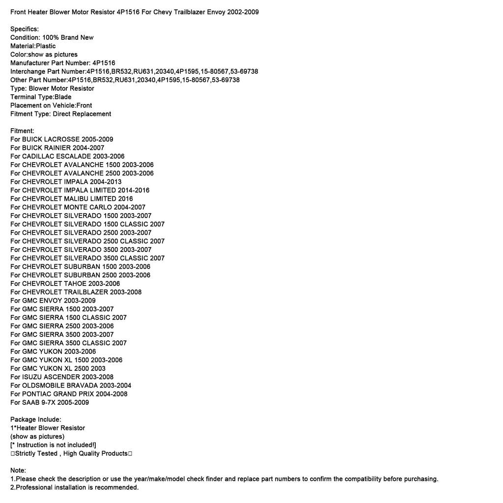 Front Heater Blower Motor Resistor 4P1516 For Chevy Trailblazer Envoy 2002-2009