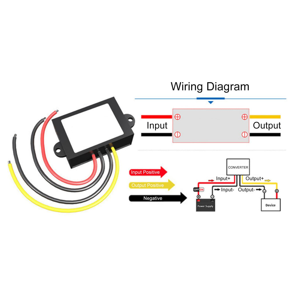 Indgangskabelfarve: (+) Rød, (-) Sort. Udgangskabelfarve: (+) Gul, (-) Sort.