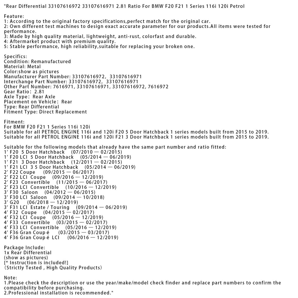 Hinterachsdifferential 33107616972 33107616971 2,81 Verhältnis Für BMW F20 F21 1 Serie 116i 120i Benzin