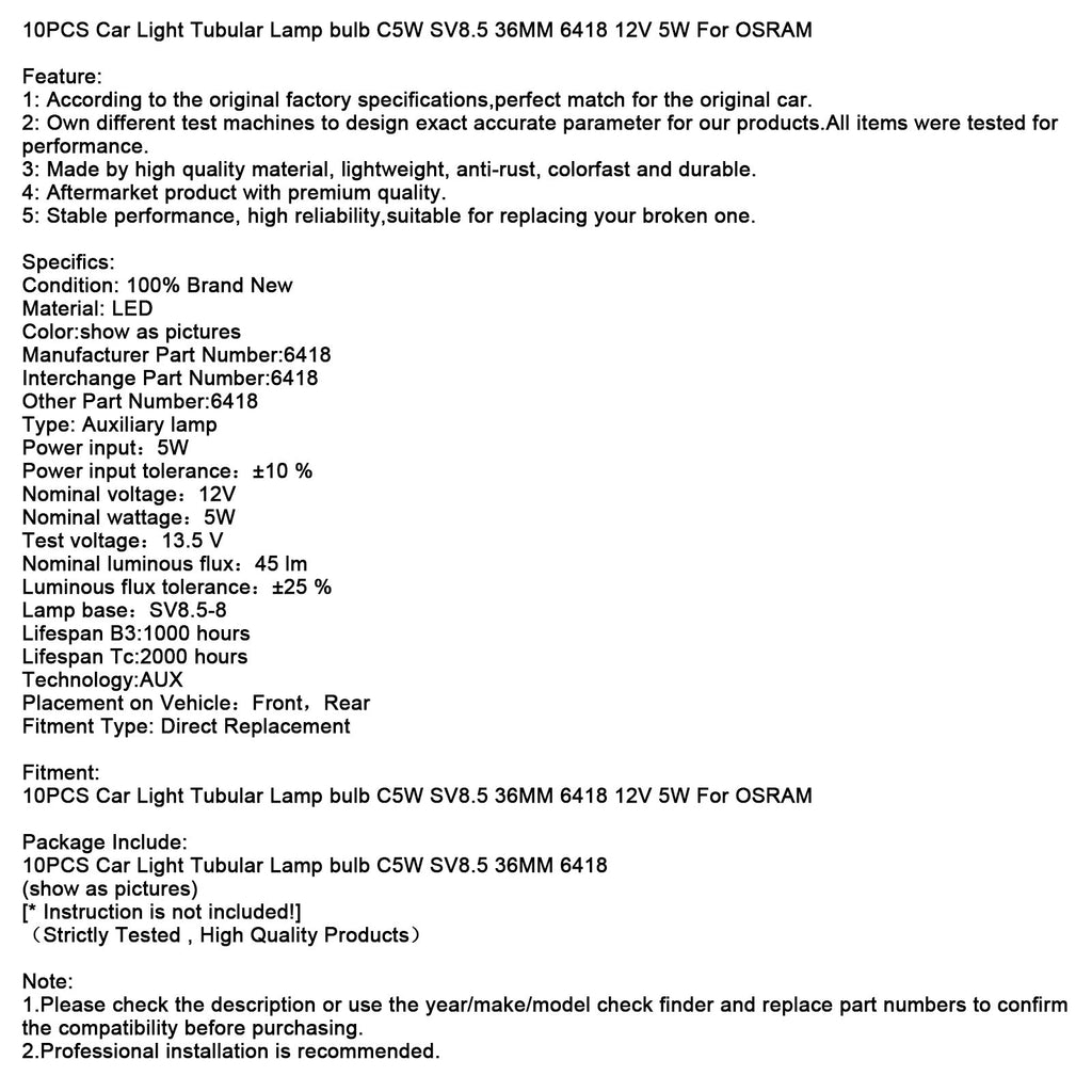 10 STÜCKE Auto Licht Rohrlampe birne C5W SV8.5 36 MM 6418 12 V 5 Watt Für OSRAM