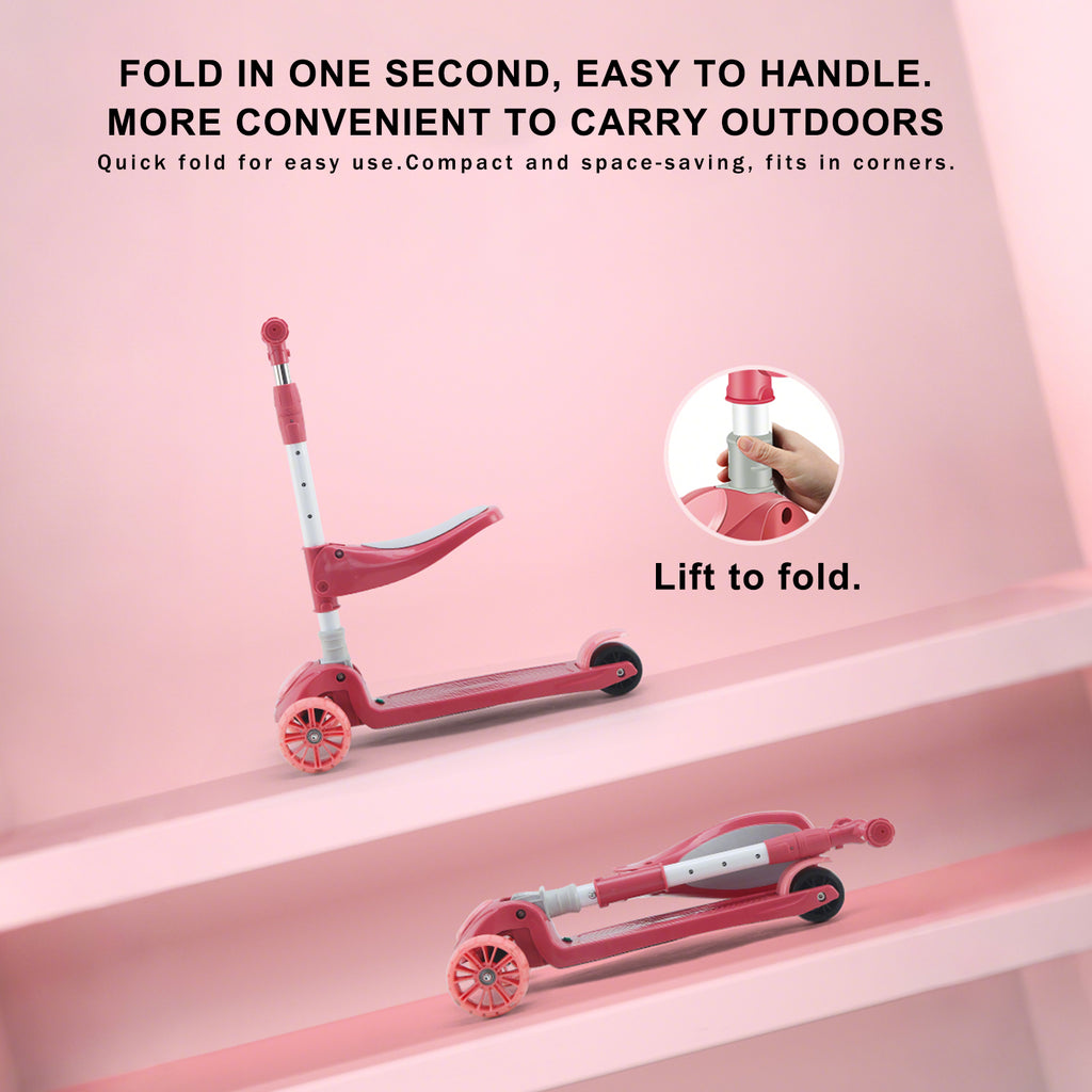 1.2-in-1-Design – Nutzbar als normaler Steh-Scooter oder als Rutschfahrzeug mit dem integrierten, klappbaren Sitz.