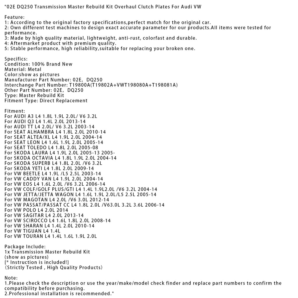 2010-2014 SEAT ALHAMBRA L4 1.8L 2.0L Transmission Master Rebuild Kit Overhaul Clutch Plates 02E DQ250 T19800A