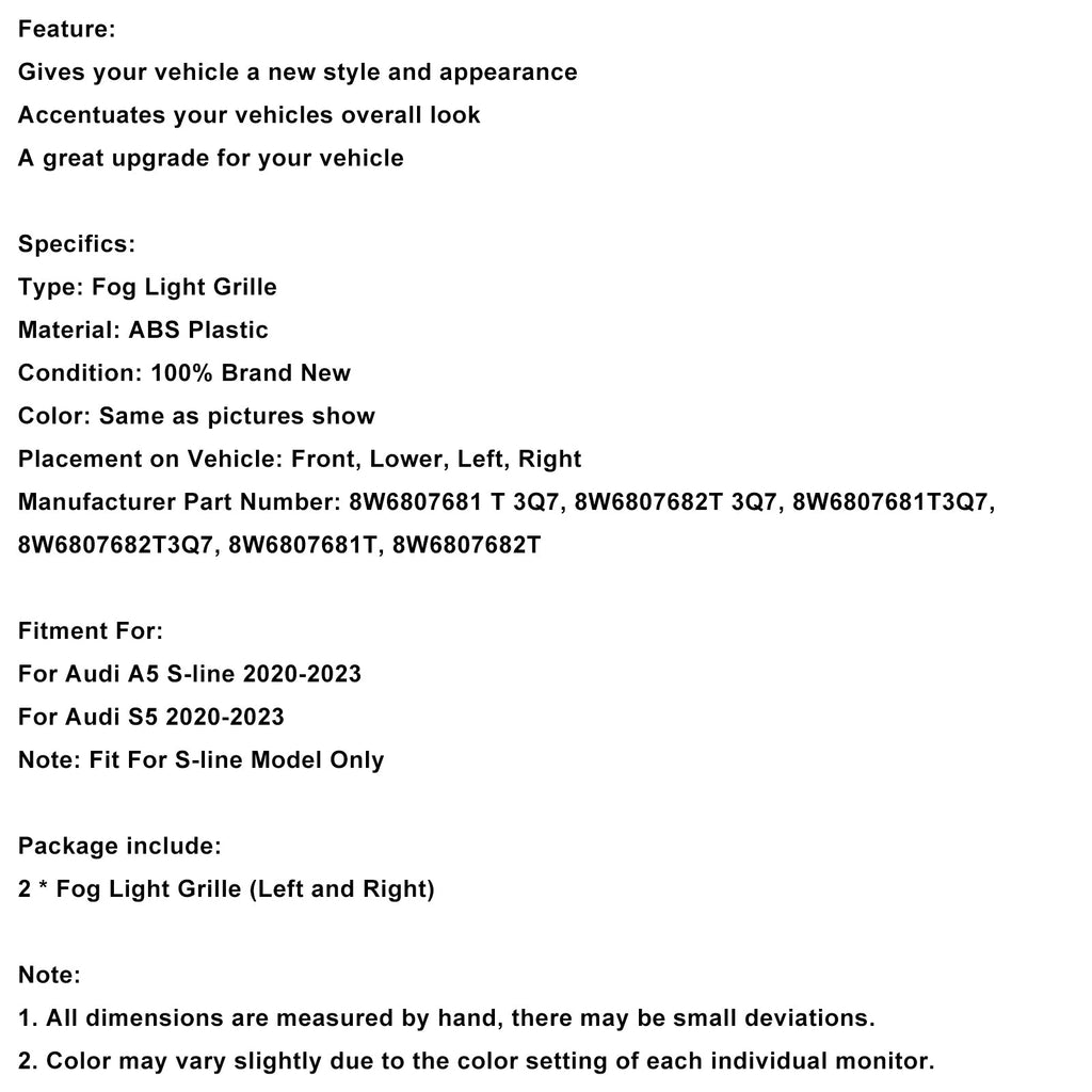 2PCS Front Stoßstange Nebel Licht Abdeckung Grille 8W6807682T3Q7 Fit für Audi S5 2020-2023