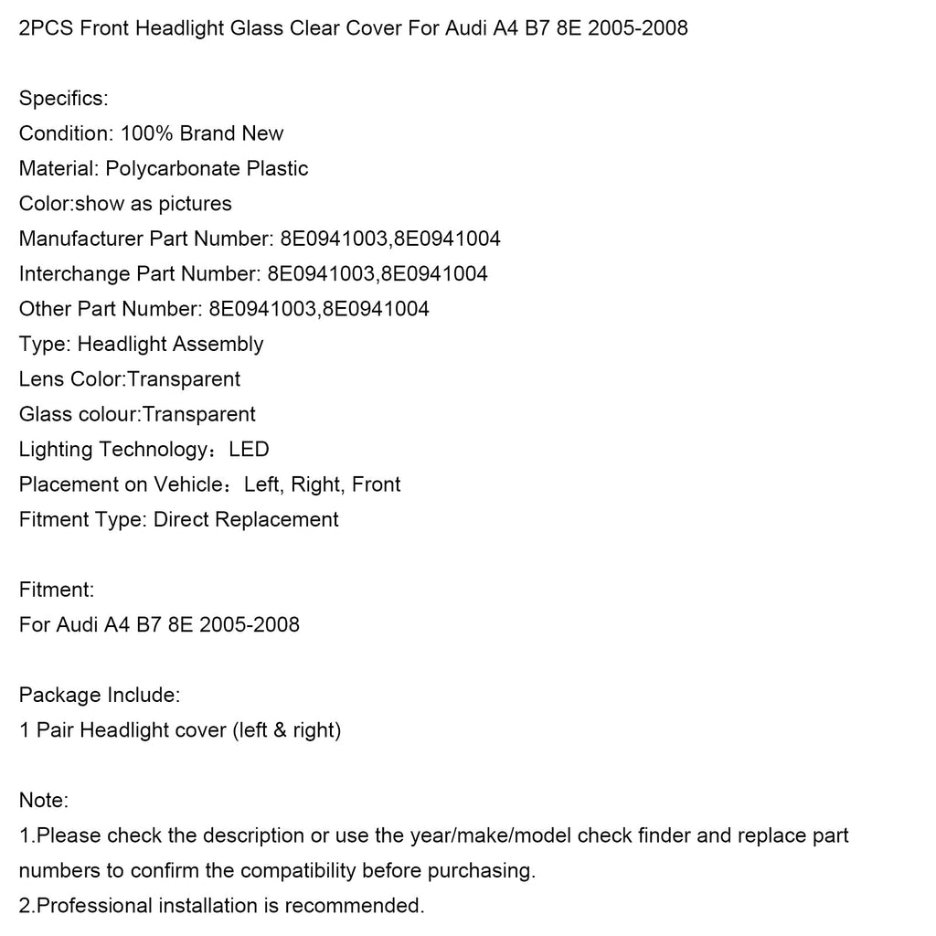 2PCS Front Scheinwerfer Glas Klar Abdeckung Für Audi A4 B7 8E 2005-2008
