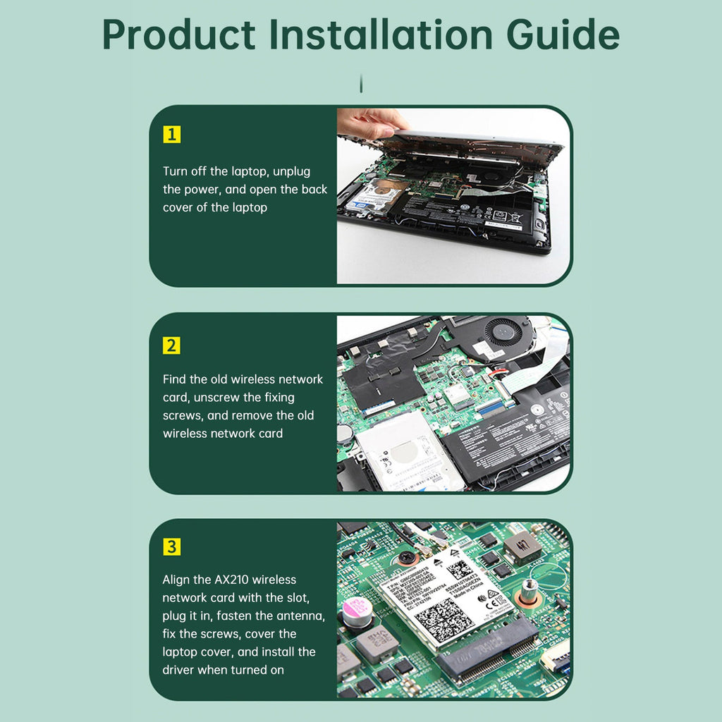 3. Richten Sie die drahtlose Netzwerkkarte AX210 am Steckplatz aus, schnallen Sie die Antenne an, ziehen Sie dann die Schrauben fest und decken Sie die Laptopabdeckung ab, schalten Sie den Computer ein und installieren Sie den Treiber.
