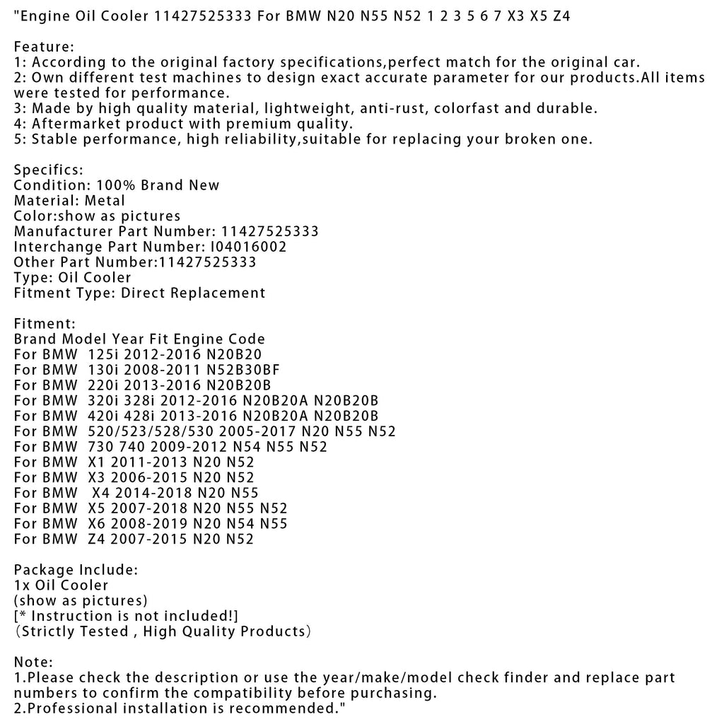 Motorölkühler 11427525333 Für BMW N20 N55 N52 1 2 3 5 6 7 X3 X5 Z4