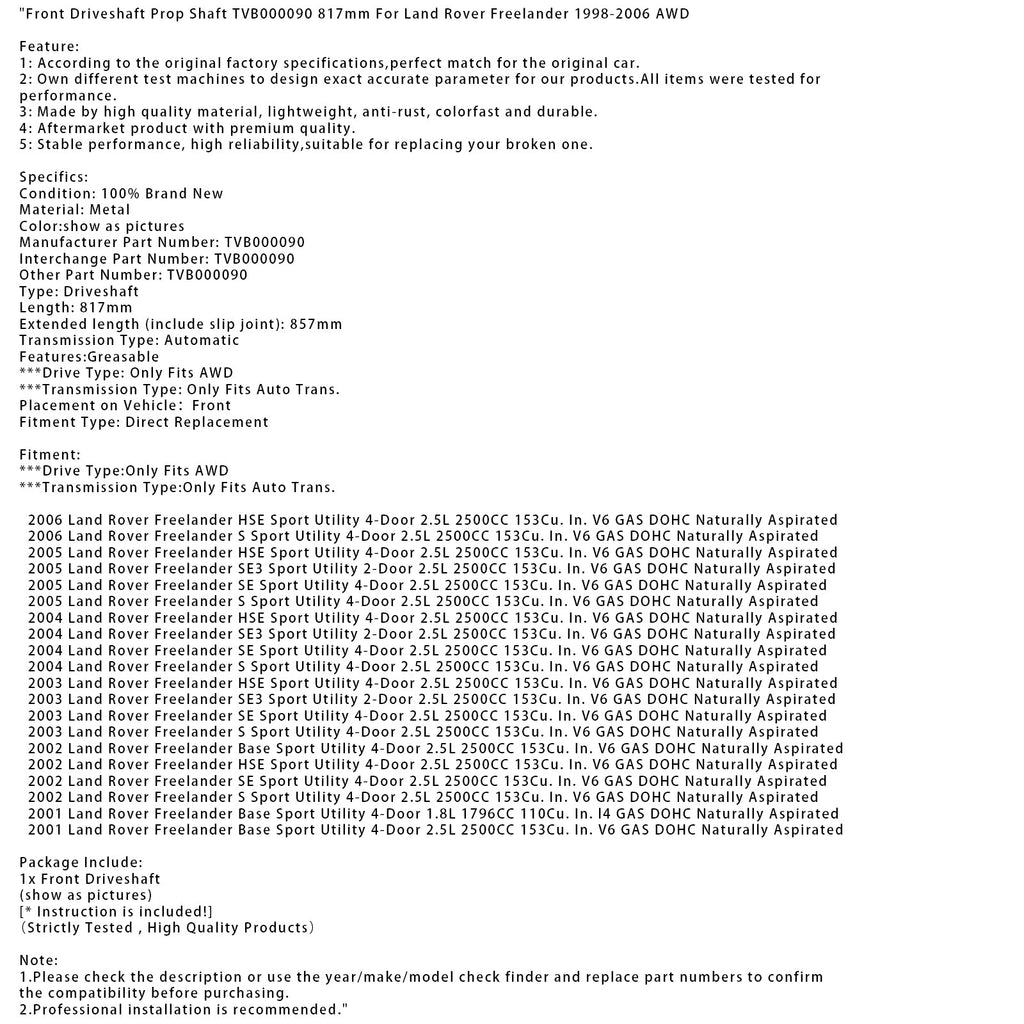 Front Driveshaft Prop Shaft TVB000090 817mm Fit For Land Rover Freelander 1998-2006 AWD