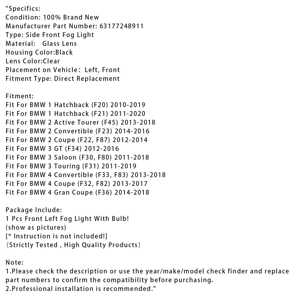 1 Pcs Vorne Links Nebel Licht Ohne Leuchtmittel Für BMW F20 F21 F30 F31 F80 2011-2019