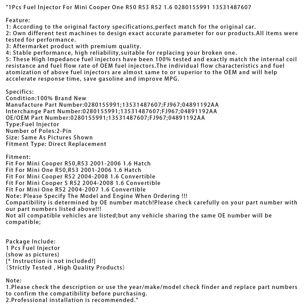 1 Stück Einspritzdüse für Mini Cooper One R50 R53 R52 1.6 0280155991 13531487607