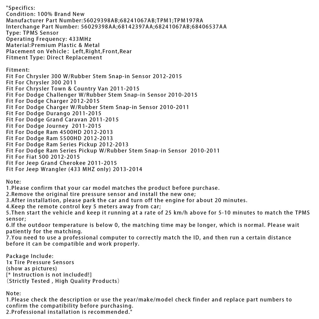 1X TPMS Reifendruck Sensor Für Dodge Jeep Chrysler RAM 56029398AB