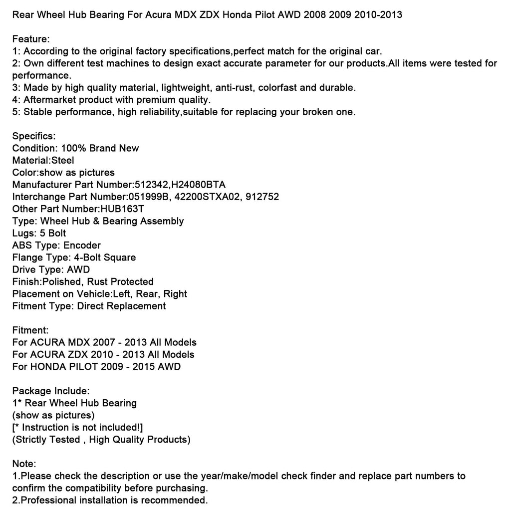 2009–2015 HONDA PILOT AWD Hinterradnabenlager 512342 H24080BTA 42200STXA02