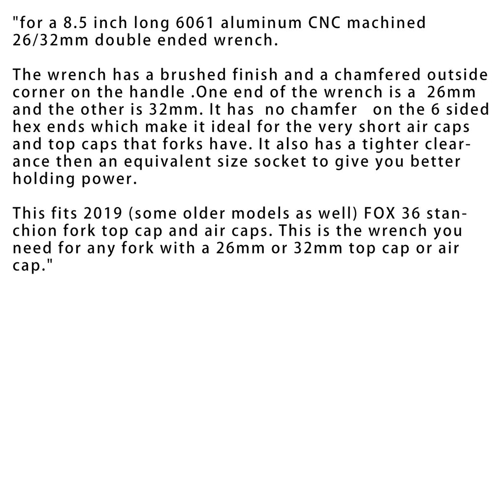 Der Schlüssel hat eine gebürstete Oberfläche und eine abgeschrägte Außenkante am Griff. Ein Ende des Schlüssels ist 26 mm, das andere 32 mm lang. Er hat keine Fase an den sechseckigen Sechskantenden und ist daher ideal für die sehr kurzen Luftkappen und Top-Caps von Gabeln. Er hat außerdem einen geringeren Abstand als ein Steckschlüssel gleicher Größe, was für eine bessere Haltekraft sorgt.