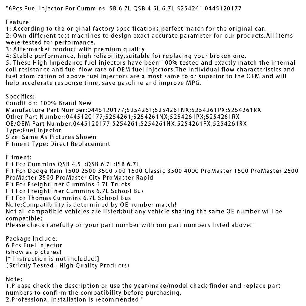 6 Stück Einspritzdüsen für Cummins ISB 6.7L QSB 4.5L 6.7L 5254261 0445120177