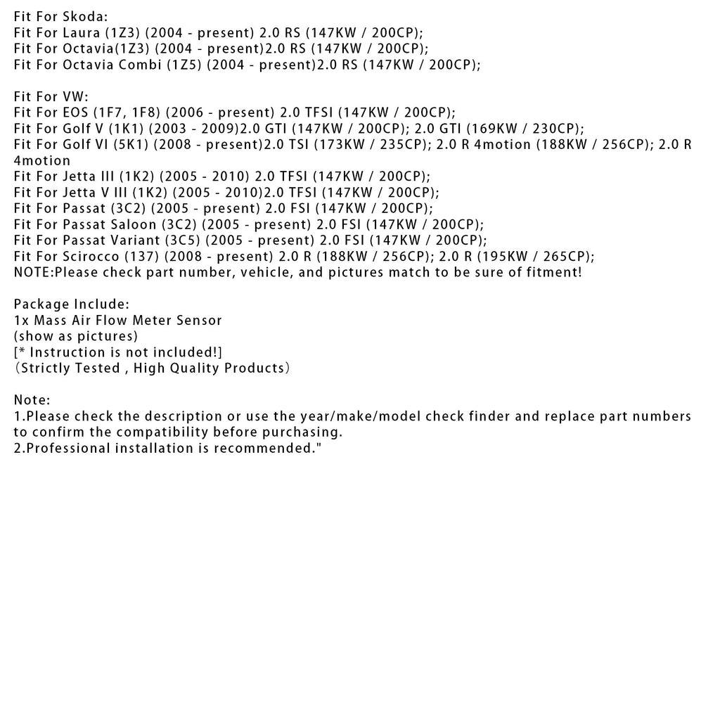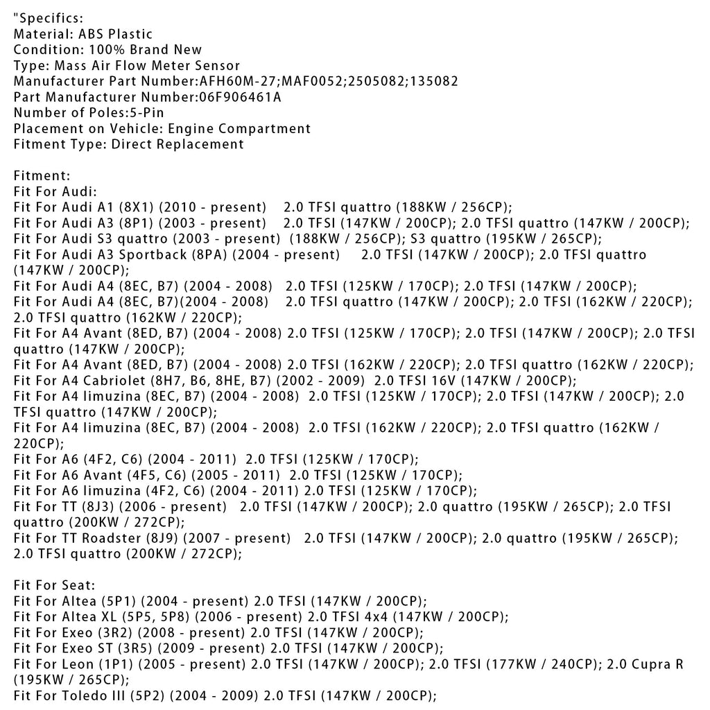 Mass Air Flow Meter Sensor For Audi A4 B7 S3 TT VW Golf GTI 2.0T 06F906461A