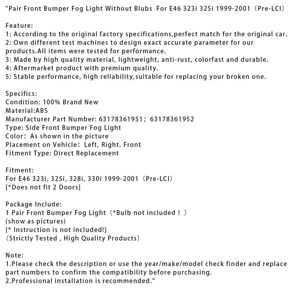 Paar Nebelscheinwerfer für die Frontstoßstange ohne Glühbirnen für E46 323i 325i 1999–2001 (vor LCI)