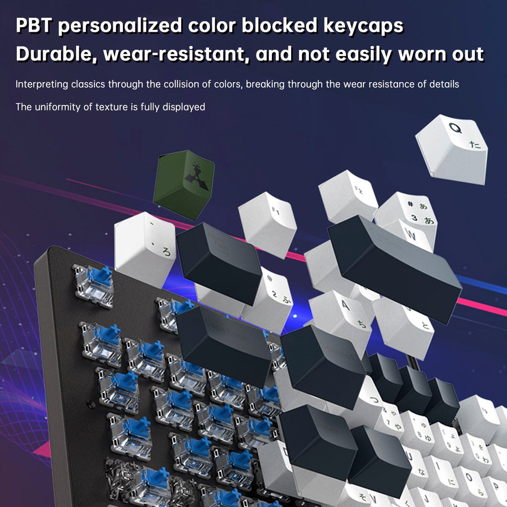 2. Farblich abgesetzte PBT-Tastenkappen, langlebig und verschleißfest. Die markante Farbpalette fängt die Essenz klassischen Designs ein und bietet gleichzeitig außergewöhnliche Verschleißfestigkeit und gleichmäßige Oberflächenstruktur.