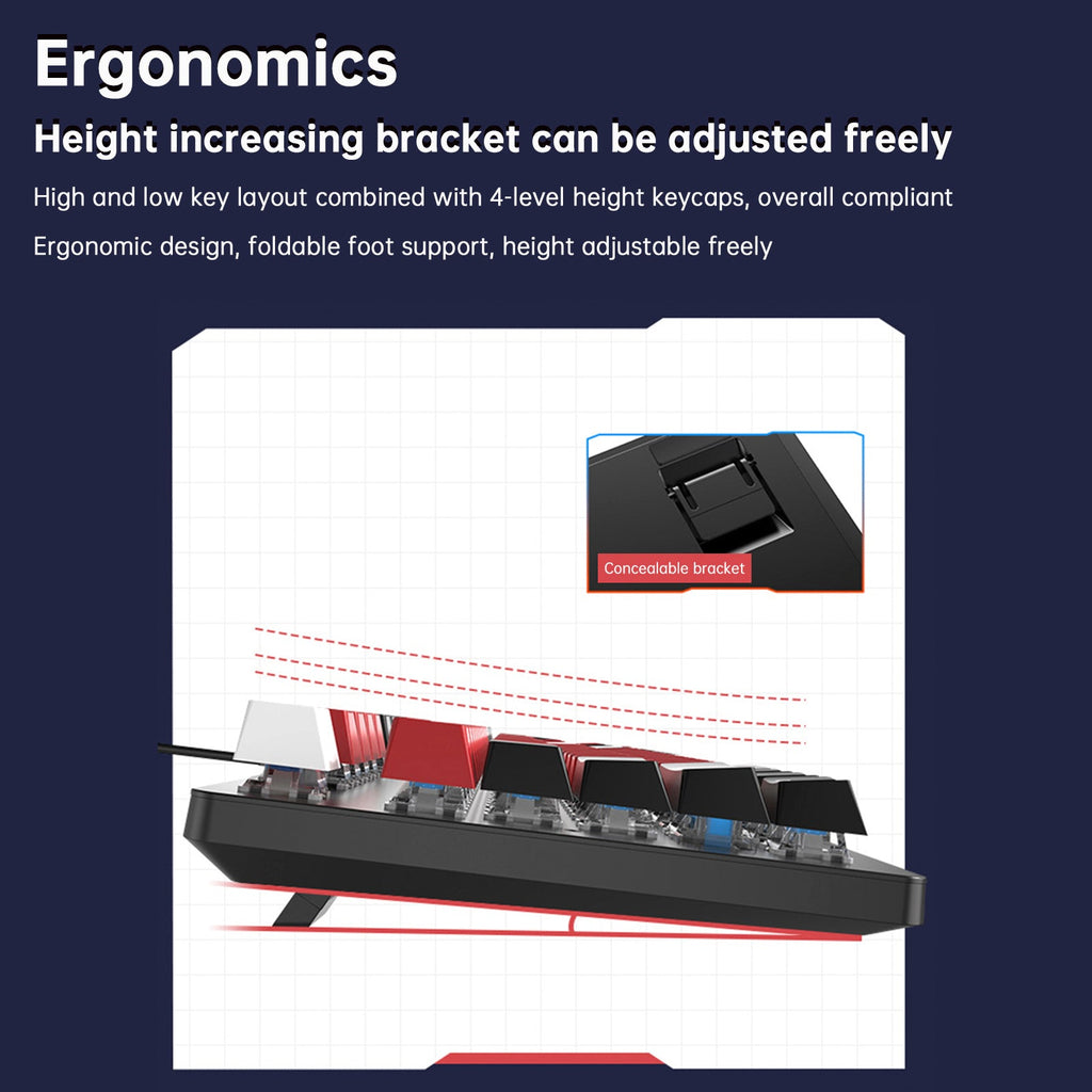 6. Ein ergonomisch gestalteter Ständer. Verstellbar und vielseitig. Die Anordnung der hohen und niedrigen Tasten ist auf die vierstufige Tastenkappenhöhe abgestimmt und sorgt so für ein ergonomisches Design. Die klappbare Fußstütze ermöglicht eine flexible Höhenverstellung.