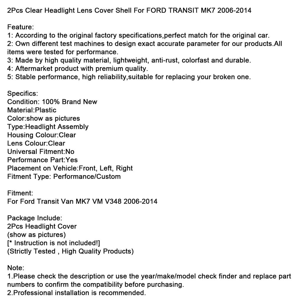 2 Stück klare Scheinwerfer-Linsenabdeckungen passend für FORD TRANSIT MK7 2006-2014