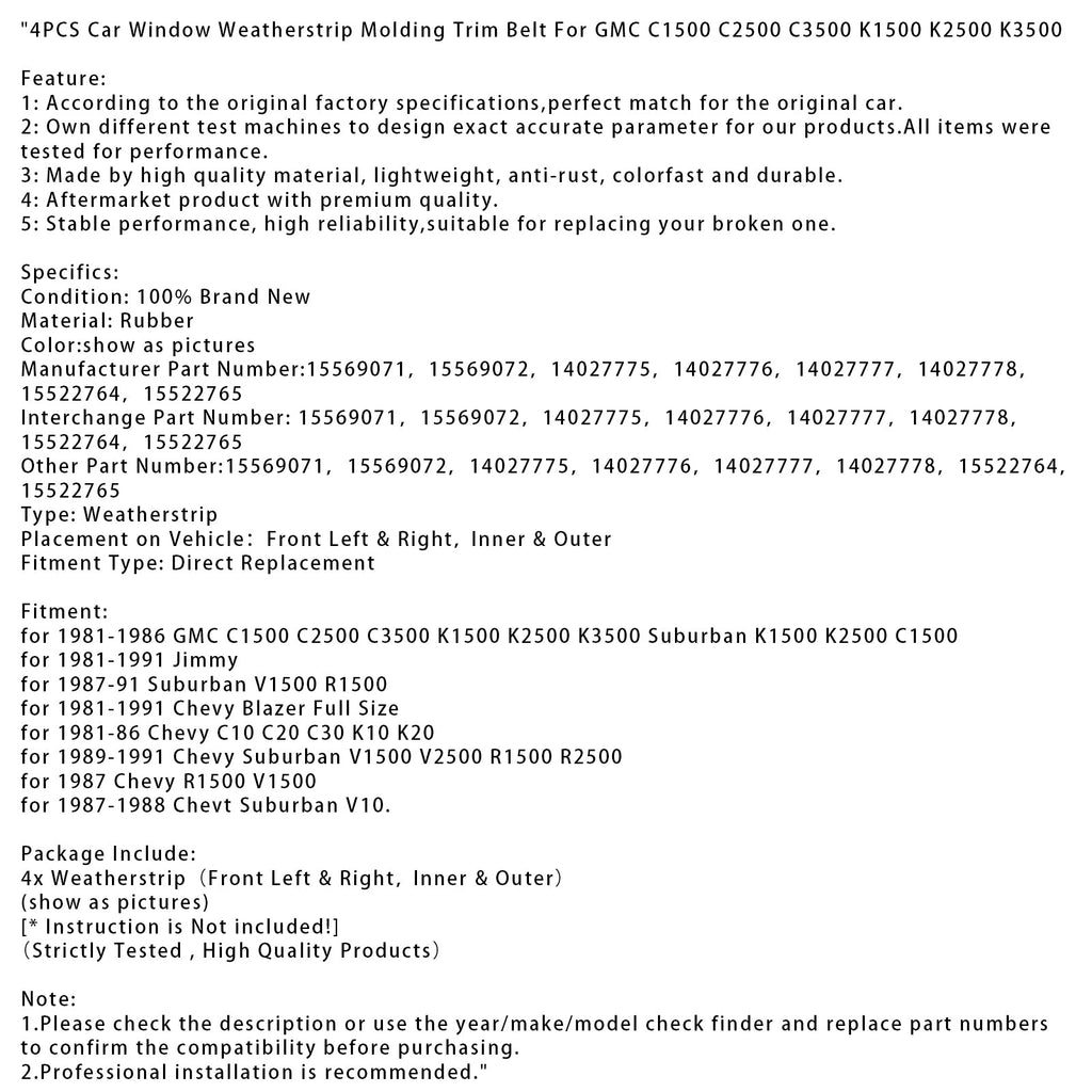 4 STÜCKE Autofenster Weathers Molding Trim Gürtel + 2 Fensterdichtungen für GMC C1500 C2500 C3500 K1500 K2500 K3500