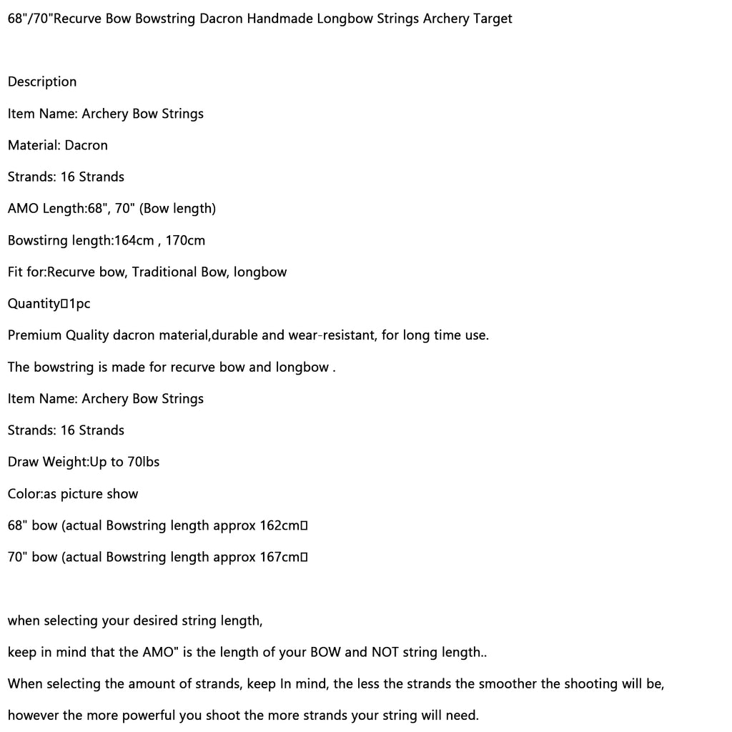 Arco recurvo de 68 "/70" Cuerda para arco Dacron Cuerdas para arco largas hechas a mano Objetivo de tiro con arco