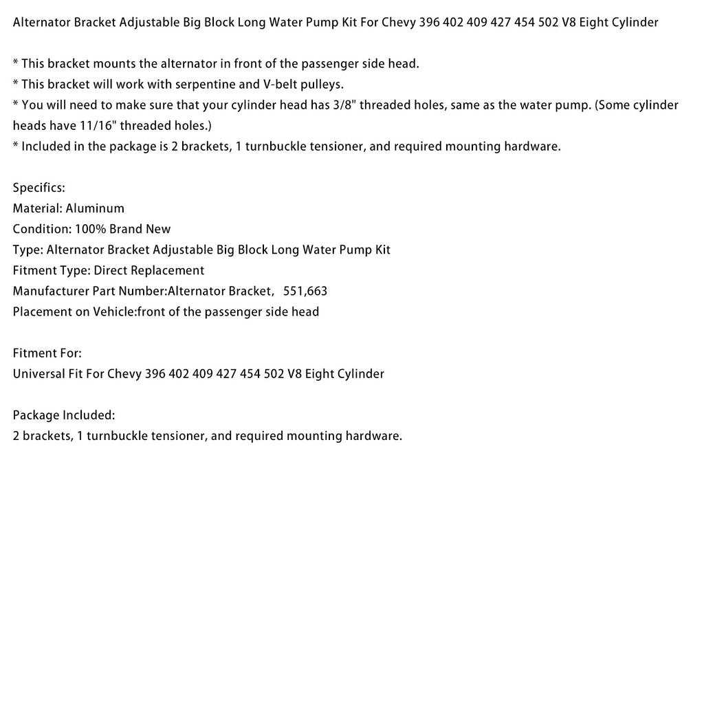Verstellbare Lichtmaschinenhalterung und lange Wasserpumpe passend für Chevy 396, 402, 409, 427, 454 und 502 V8-Achtzylinder