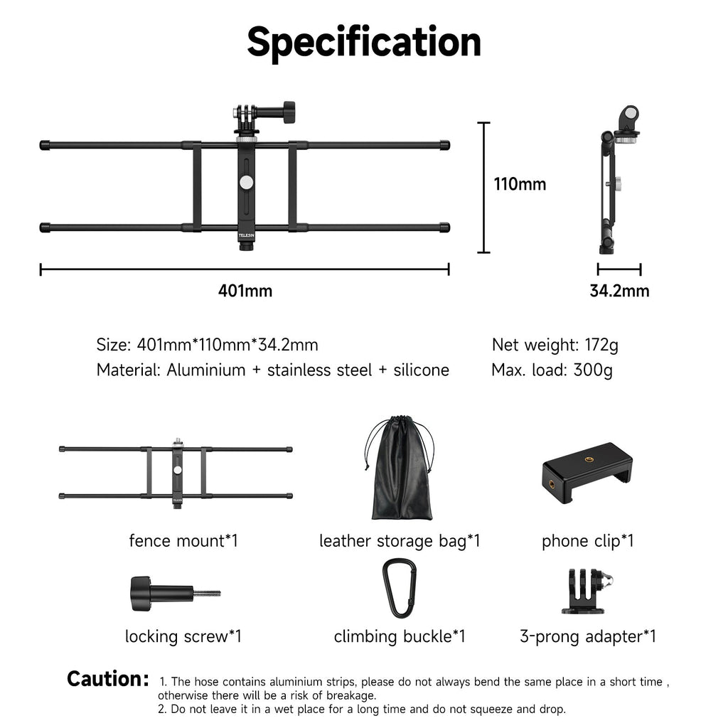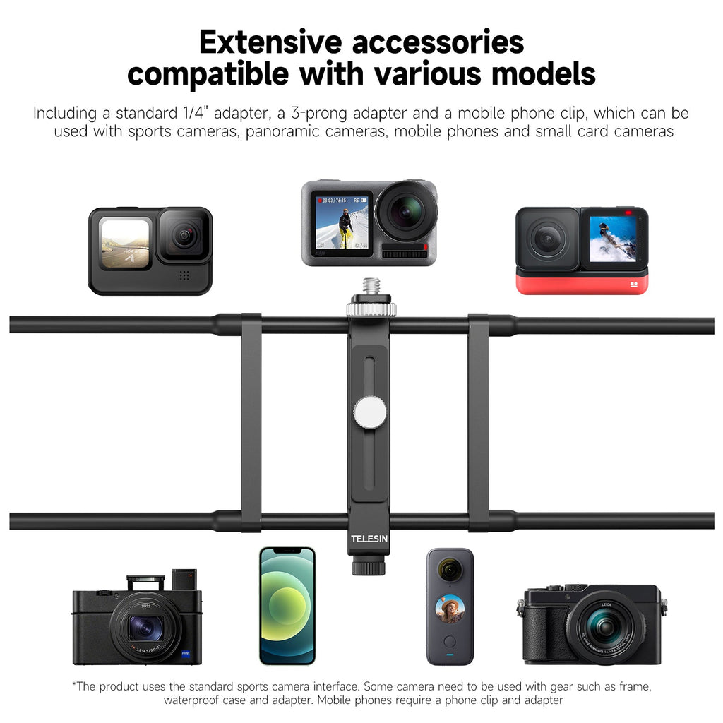 Umfangreiches Zubehör ist für verschiedene Modelle geeignet, mit einem 1/4-Standardadapter, einem Drei-Klauen-Adapter und einer Handyhalterung. Es kann an Sportkameras, Panoramakameras, Handys, kleine Kartenkameras und andere Geräte angepasst werden.