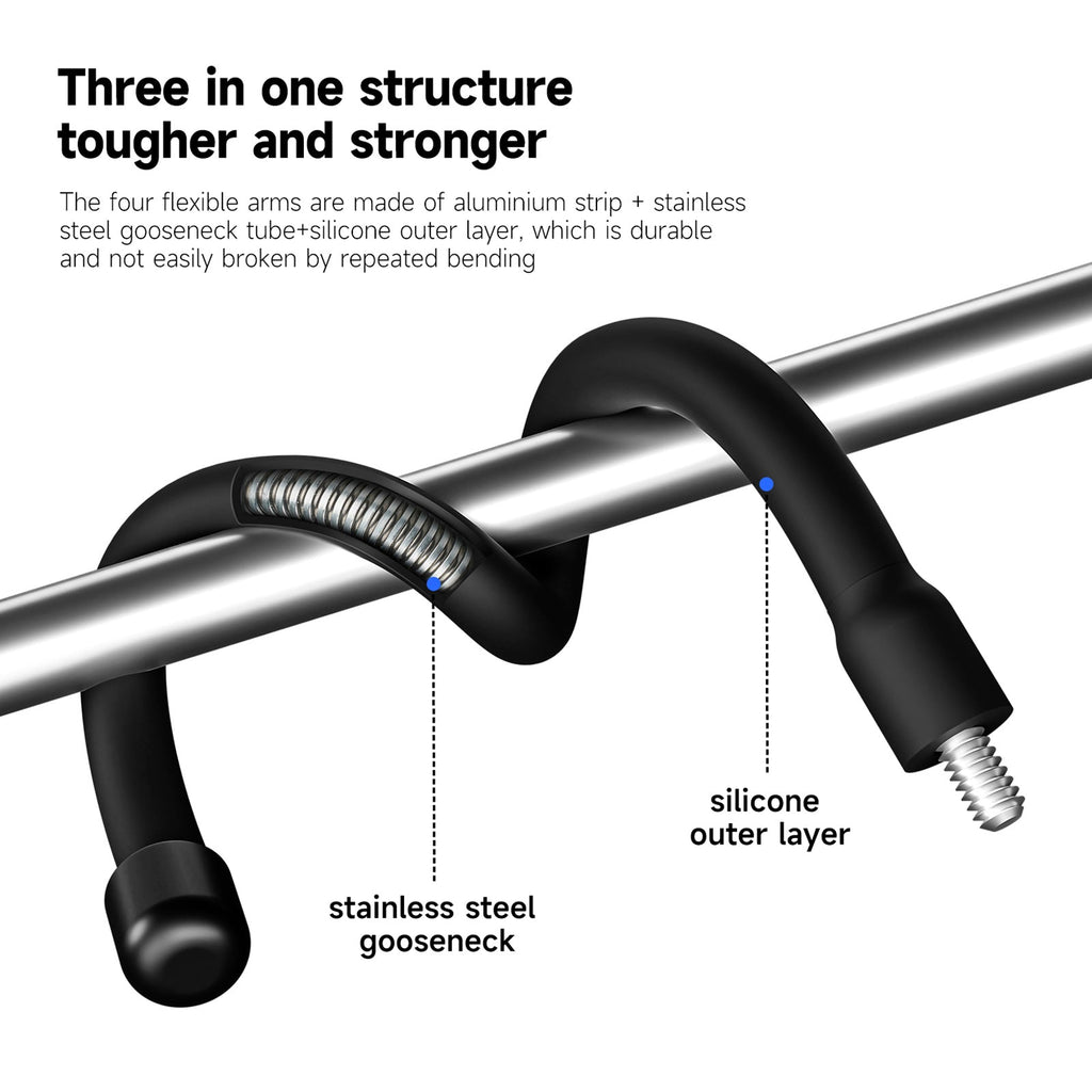 Drei-in-Eins-Struktur, robuster und stärker. Die vier flexiblen Arme bestehen aus Aluminiumstangen + Schwanenhalsrohren aus Edelstahl + äußerer Silikonstruktur, die langlebig ist und nach mehreren Biegungen nicht leicht bricht