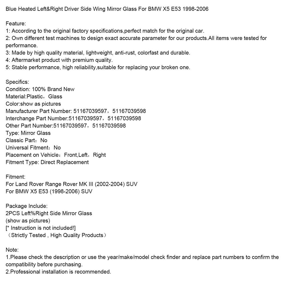 Blau Beheizte Links & Rechts Fahrer Seite Flügel Spiegel Glas Für BMW X5 E53 1998-2006