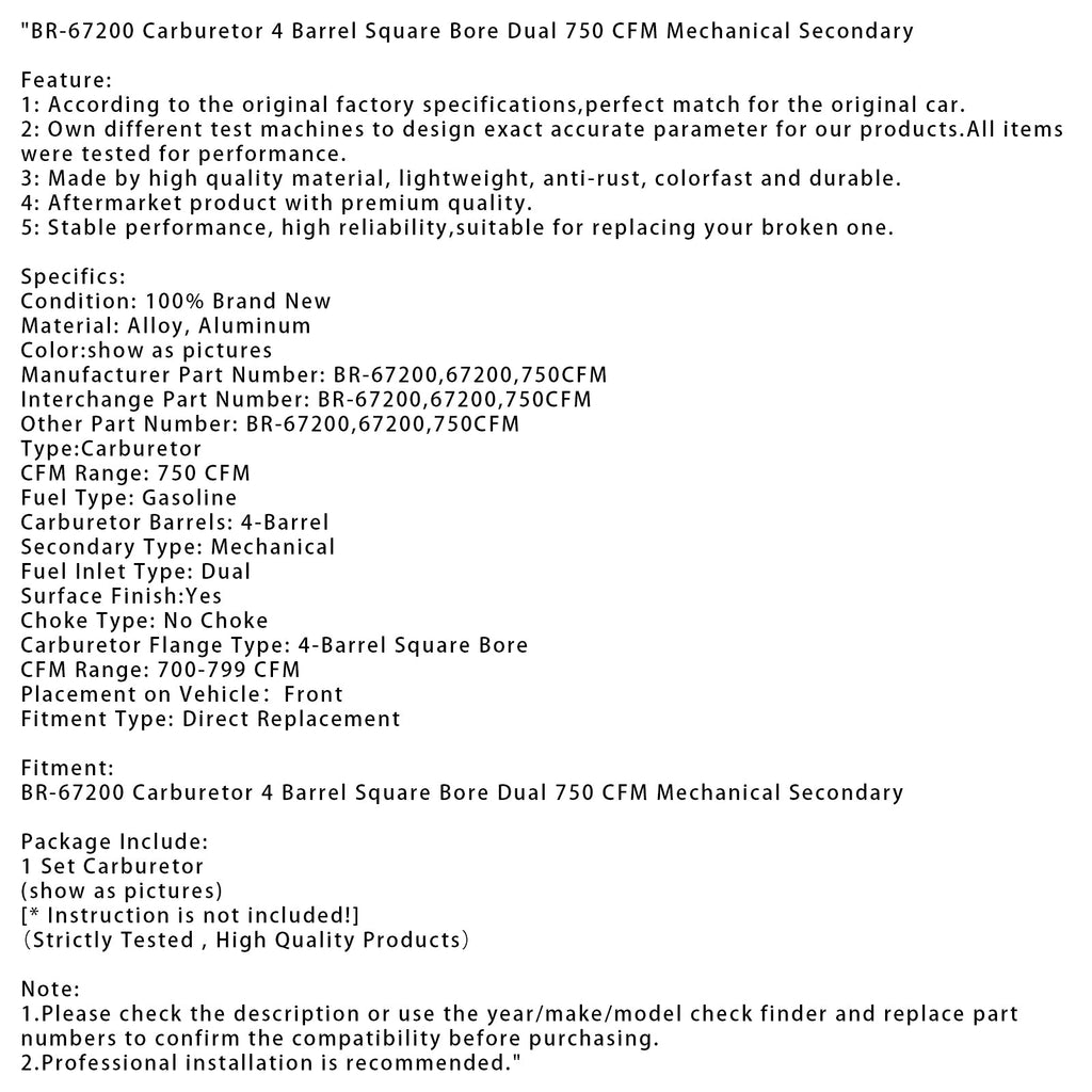 BR-67200 Vergaser 4 Barrel Square Bore Dual 750 CFM Mechanische Sekundär