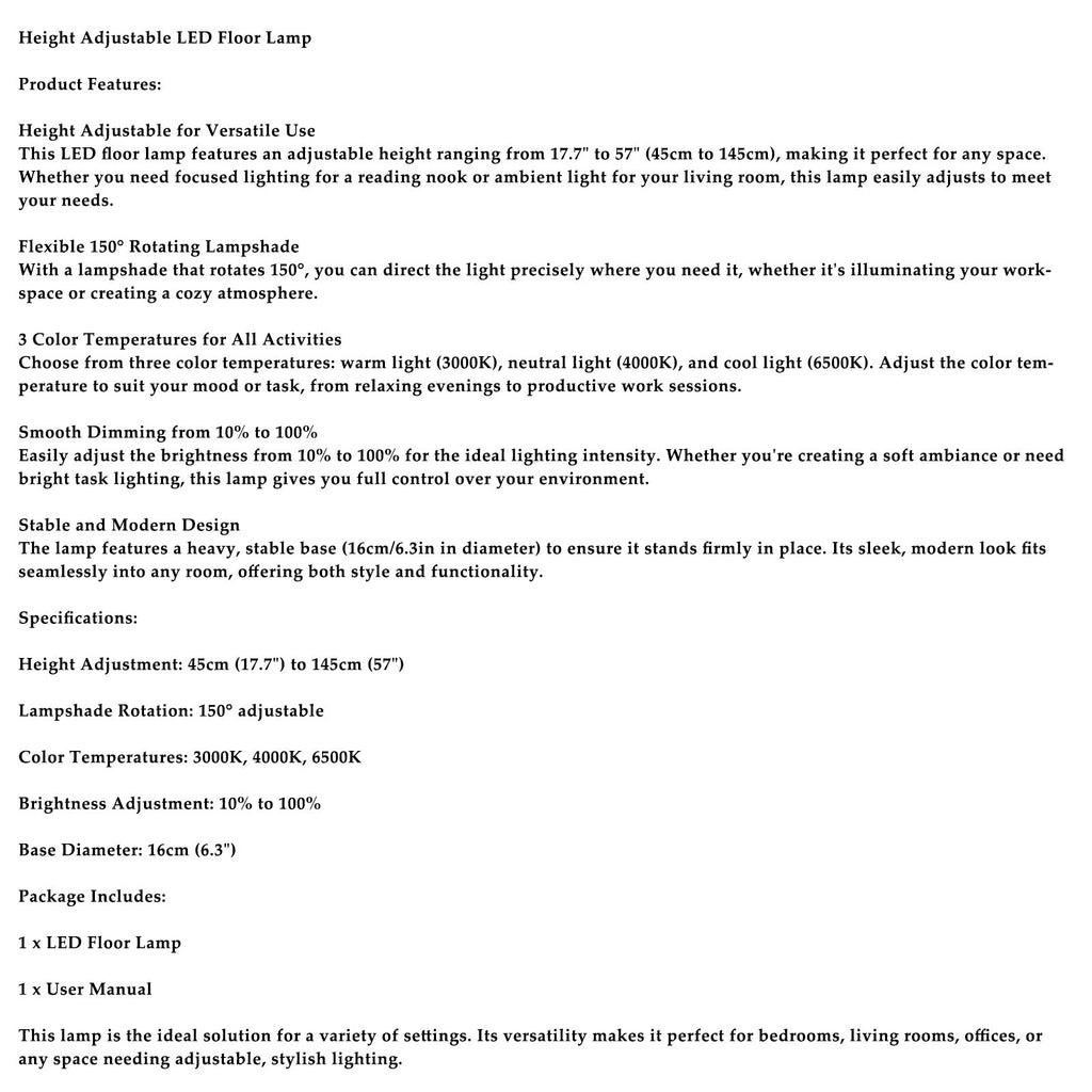 Diese LED-Stehlampe ist höhenverstellbar von 45 cm bis 145 cm und passt sich so jedem Raum perfekt an. Ob Sie gezieltes Licht für eine Leseecke oder stimmungsvolles Licht für Ihr Wohnzimmer benötigen – diese Lampe lässt sich ganz einfach an Ihre Bedürfnisse anpassen.