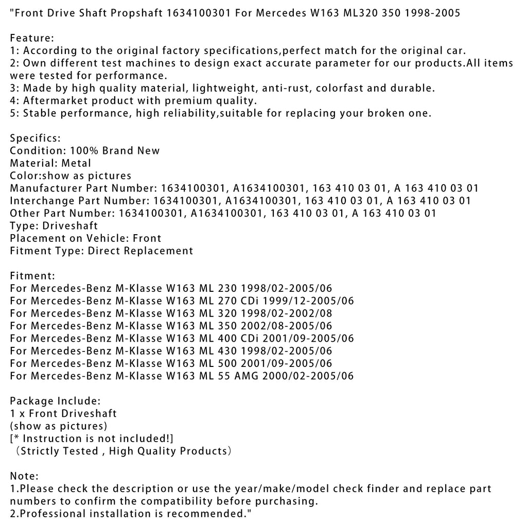 Eje de transmisión delantero Eje interior 1634100301 para Mercedes W163 ML320 350 1998-2005