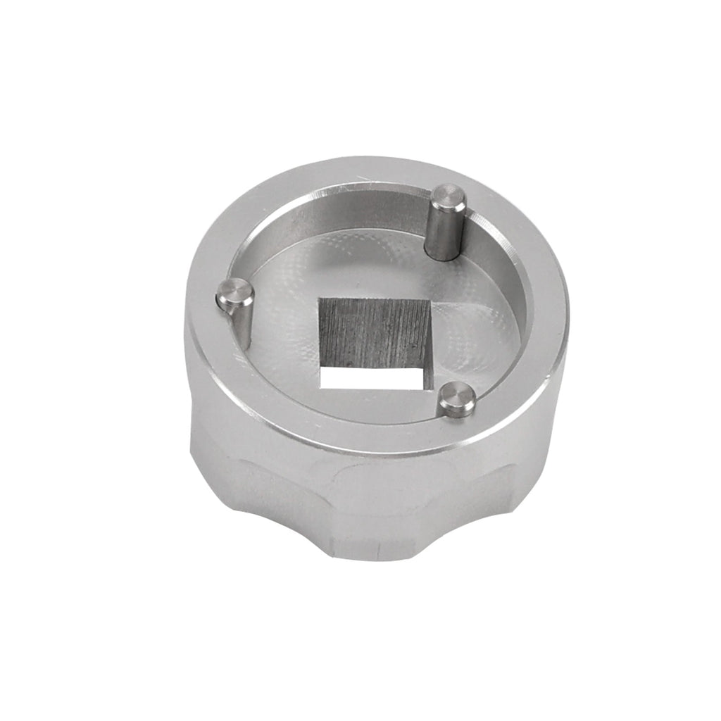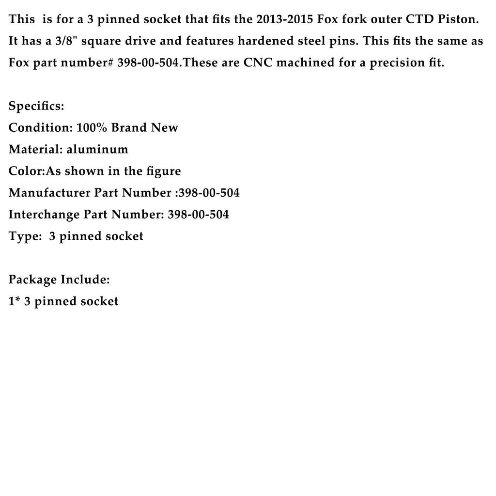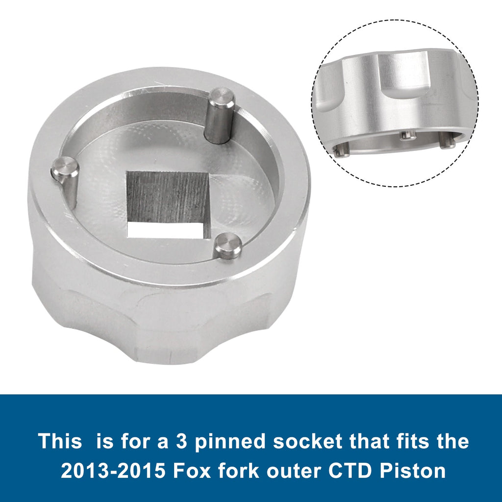 Dies ist eine 3-polige Stecknuss, die für den äußeren CTD-Kolben der Fox-Gabel (2013–2015) geeignet ist. Sie verfügt über einen 3/8-Zoll-Vierkantantrieb und gehärtete Stahlstifte. Passt zum Fox-Teil Nr. 398-00-504. Die CNC-gefrästen Stecknüsse gewährleisten eine präzise Passform.