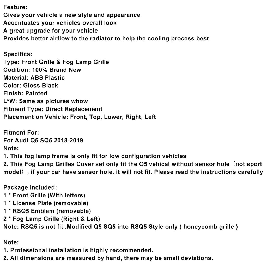 2. Dieses Nebelscheinwerfergitter-Abdeckungsset passt nur für Q5-Fahrzeuge ohne Sensorloch (nicht für Sportmodelle). Wenn Ihr Auto über ein Sensorloch verfügt, passt es nicht. Bitte lesen Sie die Anweisungen sorgfältig durch