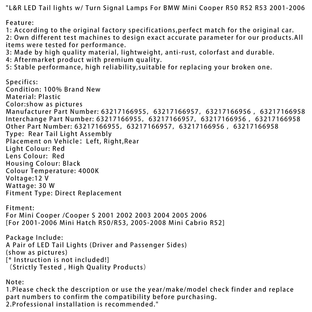 Luces traseras LED izquierda y derecha con intermitentes para BMW Mini Cooper R50 R52 R53 2001-2006