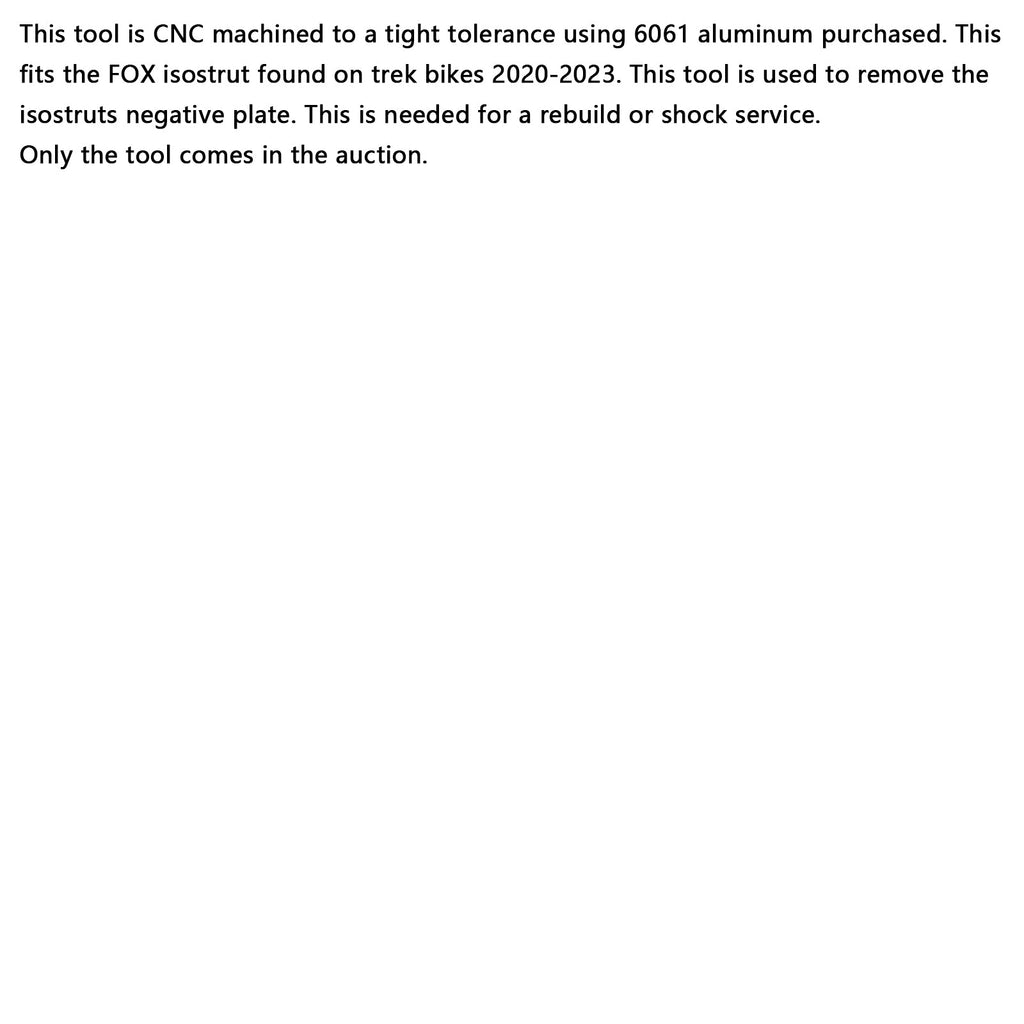 Esta herramienta está mecanizada por CNC a partir de aluminio 6061 con tolerancias estrictas. Se adapta al FOX Isostrut en bicicletas Trek 2020-2023. Esta herramienta se puede utilizar para quitar la placa negativa del isostrut. Es necesario para una revisión o servicio de amortiguadores.