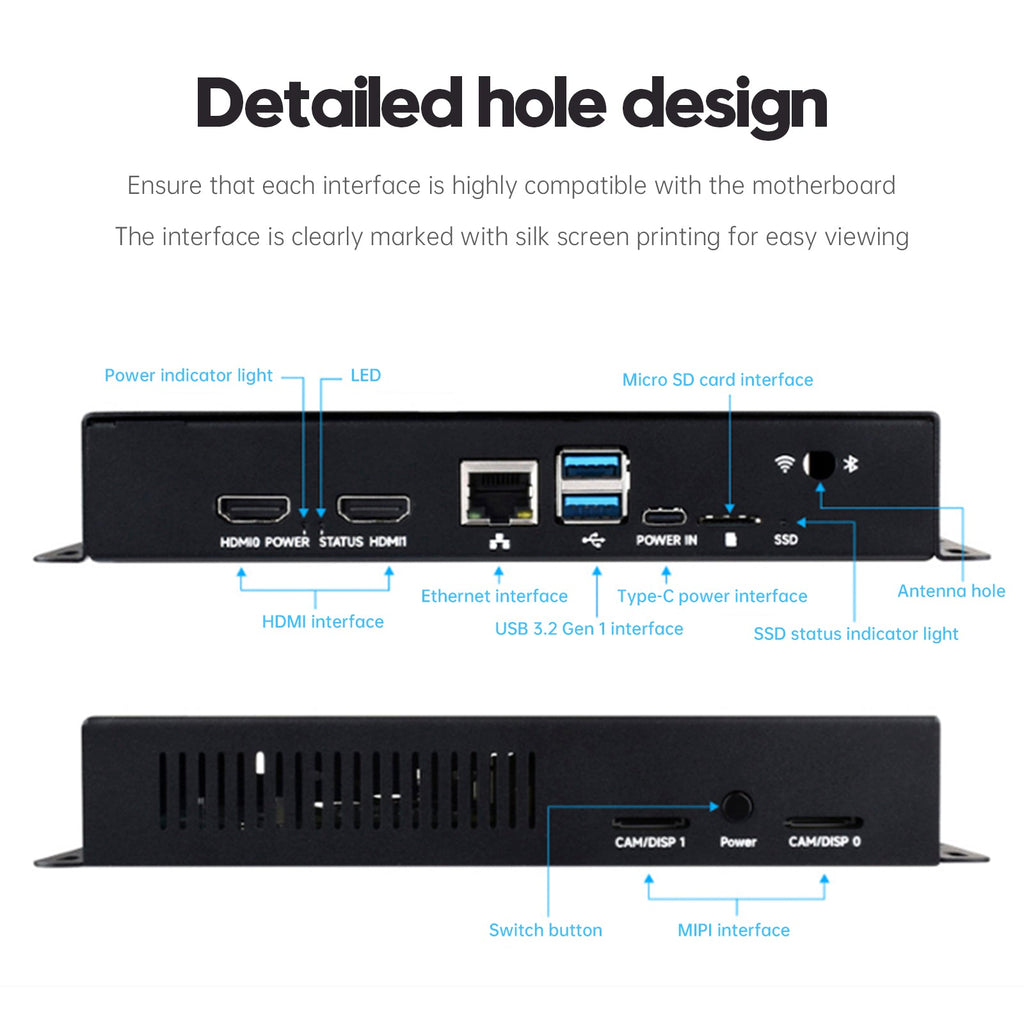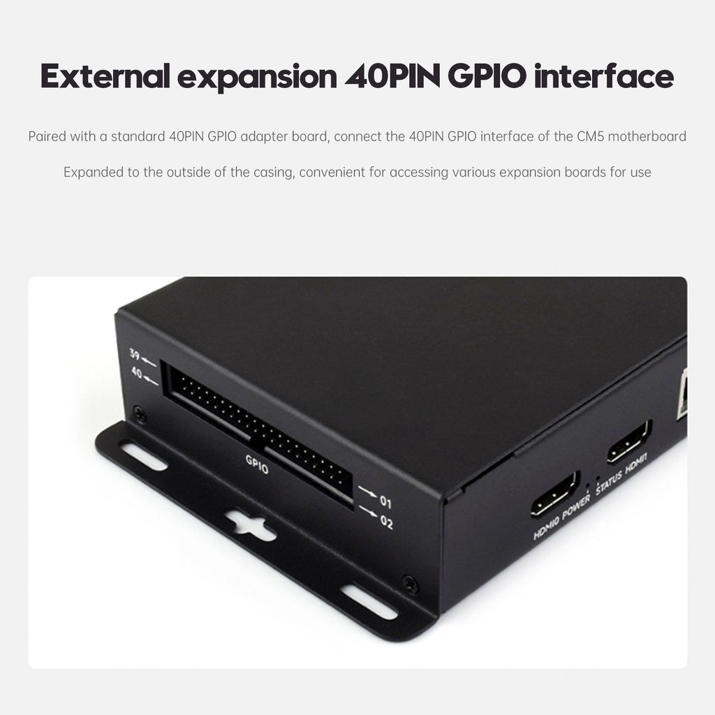 Externe Erweiterungsschnittstelle 40PIN GPIO: Mit einer standardmäßigen 40PIN GPIO-Adapterkarte wird die 40PIN GPIO-Schnittstelle der CM5-Basisplatine auf die Außenseite des Gehäuses erweitert, was den Zugriff auf verschiedene Erweiterungskarten erleichtert.