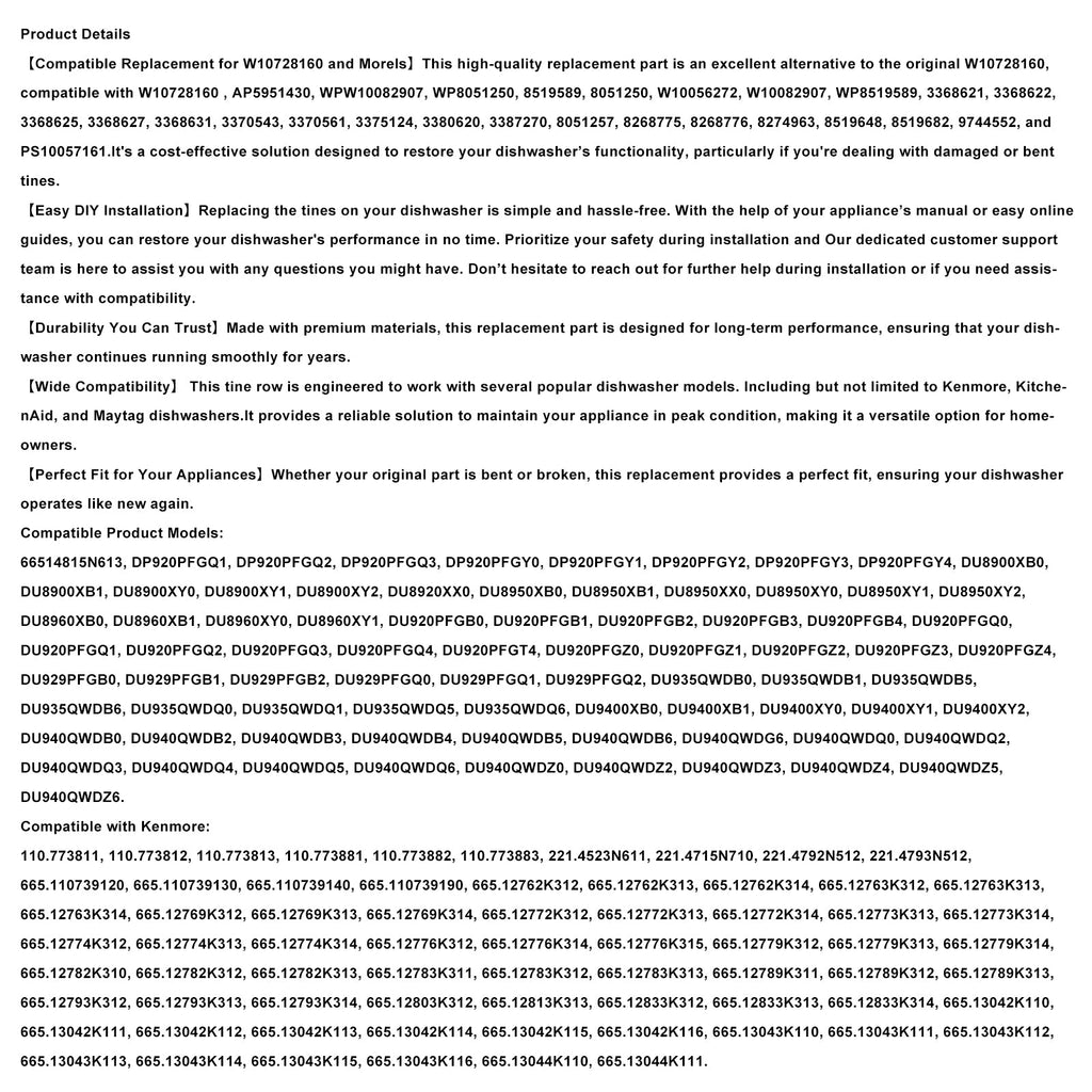 【Amplia compatibilidad】Esta fila de púas está diseñada para usarse con varios modelos de lavavajillas comunes. Incluidos, entre otros, lavavajillas Kenmore, KitchenAid y Maytag. Ofrece una solución confiable para mantener su electrodoméstico en óptimas condiciones, lo que lo convierte en una opción versátil para los propietarios de viviendas.